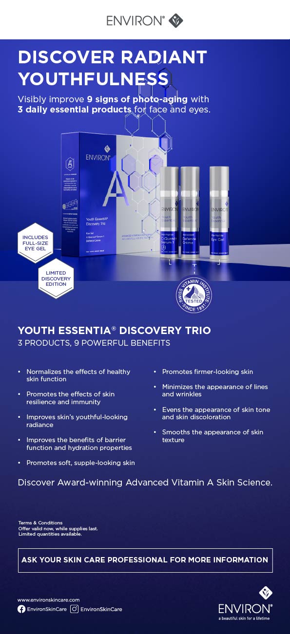 Turn back time with three of Environ’s best-selling Youth EssentiA formulations. Made with a highly effective combination of powerful retinoids, antioxidants, and peptides, this trio will visibly improve 9 signs of photo-aging. Perfect for trial and travel.
