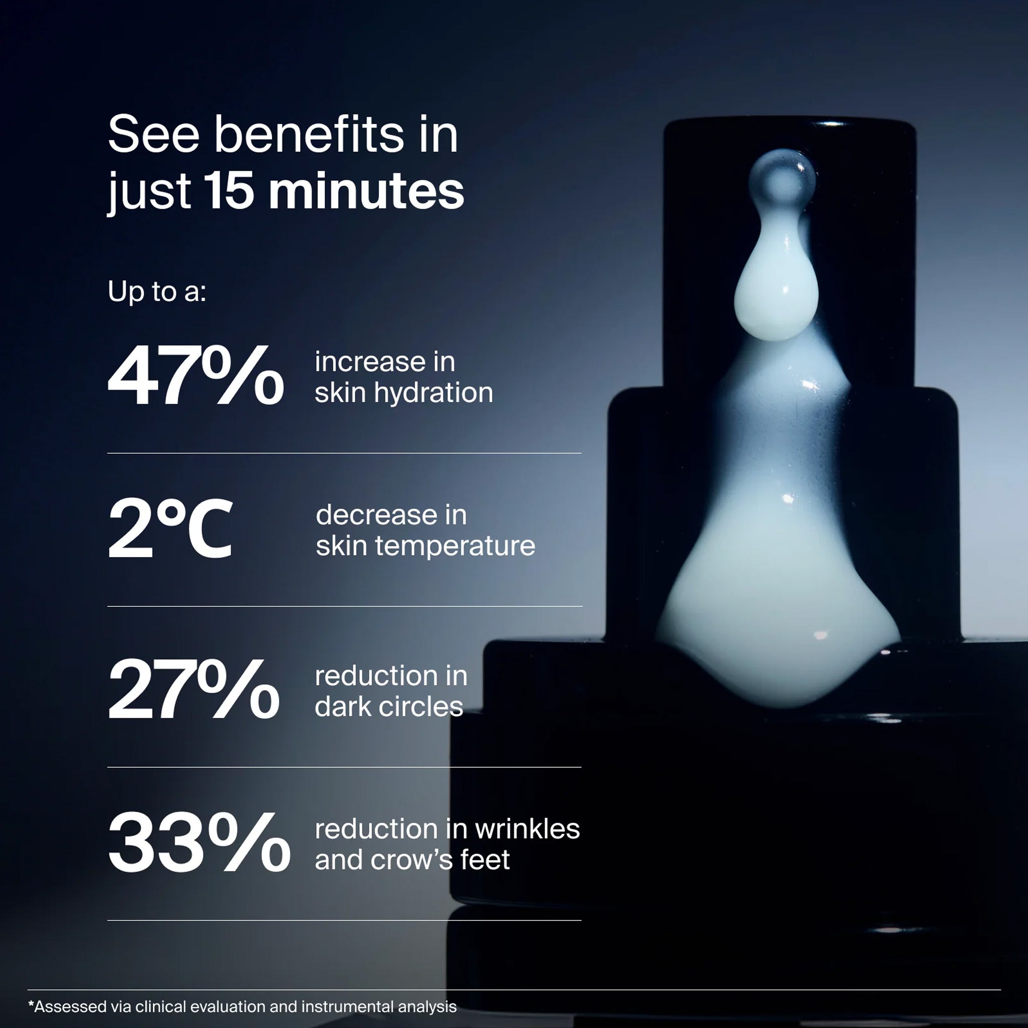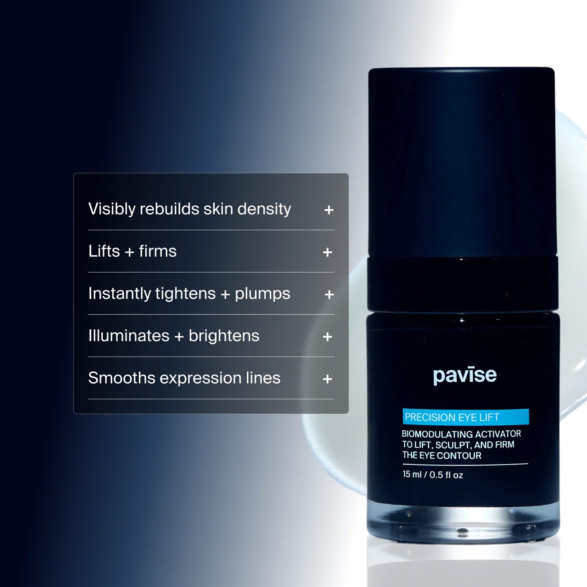 A biomodulating eye concentrate engineered to lift, firm, and visibly restore the delicate eye contour. This gel-serum reprograms biosignaling pathways to rebuild collagen, elastin, and dermal density over time—while instantly smoothing fine lines, reducing dark circles, and boosting hydration in just 15 minutes.